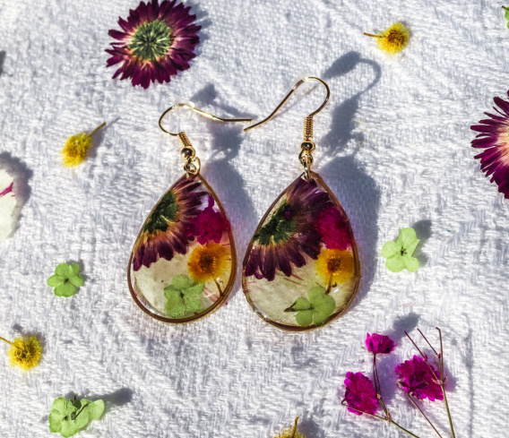 Kolczyki "Kolorowy bałagan" to prawdziwe dzieło sztuki, które zachwyci każdą miłośniczkę unikatowych dodatków. Ich niepowtarzalny design sprawia, że są one idealnym wyborem dla kobiet poszukujących czegoś więcej niż zwykłe kolczyki. Kształt łezki nadaje im subtelnego uroku, podkreślając delikatność i kobiecość noszącej go osoby. Wewnątrz znajduje się niemal cały bukiet kwiatów składający się z prawdziwych płatków astra, goździka, gipsówki, mimozy i ozdobnej hortensji. Ta różnorodność kwiatów tworzy harmonijną kompozycję o intensywnych barwach, która przyciąga spojrzenia i dodaje blasku nawet najprostszym stylizacjom. Kolczyki mogą być doskonałym prezentem dla kogoś bliskiego lub samej siebie - jako wyraz osobistego upodobania do nietuzinkowych dodatków. Bądź odważna w swoich wyborach i postaw na kolczyki "Kolorowy bałagan", które dodadzą Ci pewności siebie i sprawią, że poczujesz się wyjątkowo za każdym razem, gdy je założysz.