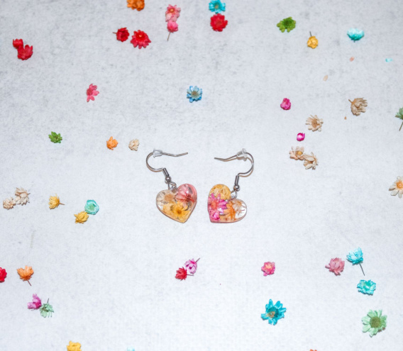 Kolczyki "Kwiatowa miłość" to wyjątkowy dodatek, który pozwoli Ci wyrazić swoją miłość do kwiatów w sposób subtelny i elegancki. Te urocze kolczyki w kształcie sercawypełnione suszonymi kwiatami, które dodają im delikatności i naturalnego piękna. Kolorowe kwiaty nadają kolczykom unikalny charakter i sprawiają, że będą one doskonałym uzupełnieniem Twojej garderoby na każdą okazję (Uwaga! Układ kwiatów i kolorów może być inny niż prezentowany na zdjęciu, kolczyki tworzące parę nie są identyczne, ale mają zachowaną tę samą kolorystykę. Kolczyki są dostępne w kilku kolorach - różowo-żółtych czy niebiesko-zielonych, zobacz na drugim zdjęciu - jeśli odcień ma dla Ciebie znaczenie napisz w wiadomości do zamówienia który kolor wybierasz).