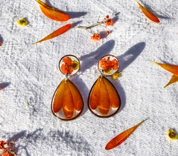 Kolczyki "Promyki Słońca" zostały stworzone z myślą o kobietach kochających intensywne kolory i oryginalne dodatki. Prawdziwe płatki gerbery w intensywnym pomarańczowym kolorze nadają im niepowtarzalny charakter, który doskonale podkreśli urodę każdej kobiety. Subtelna forma i precyzyjne wykonanie sprawiają, że jest to biżuteria idealna na wiele okazji - od codziennych stylizacji po eleganckie wieczorne wyjścia. Dodatkowo, w części sztyftu znajdują się urocze kwiaty gipsówki i mimozy, które dodają całości jeszcze więcej wdzięku. Naszyjnik "Promyki Słońca" to nie tylko biżuteria - to także hołd dla natury i jej piękna. Prawdziwe płatki gerbery zostały starannie osadzone tak, aby zachować ich naturalny blask i teksturę. To idealny sposób na noszenie ze sobą odrobinę przyrody oraz wprowadzenie do swojej garderoby elementów inspirowanych świeżością wiosennego poranka. Jeśli szukasz prezentu dla bliskiej osoby lub chcesz sprawić sobie przyjemność czymś wyjątkowym, kolczyki "Promyki Słońca" będzie strzałem w dziesiątkę. Ich unikalny design oraz wysoka jakość wykonania sprawią radość każdej kobiecie. To również doskonały sposób na podkreślenie swojego indywidualnego stylu i poczucia estetyki poprzez noszenie biżuterii inspirowanej naturą oraz sezonowymi trendami modowymi.