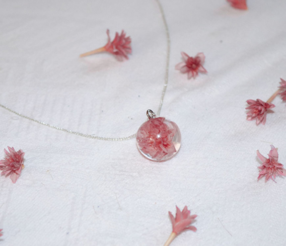 Naszyjnik "Hill flower" to subtelny i uroczy dodatek, który doda delikatności każdej stylizacji. Prawdziwy brazylijski różowy wrzos zanurzony w klarownej żywicy, ten naszyjnik jest niezwykle wyjątkowy i naturalnie piękny. Każdy detal tego naszyjnika został starannie wykonany, aby stworzyć unikalną kompozycję natury i elegancji. Przezroczysta kula nadaje całości lekkości i subtelnego blasku, podkreślając naturalne piękno wrzosu. Delikatny naszyjnik doskonale komponuje się zarówno z codziennymi stylizacjami jak i wieczorowymi kreacjami, dodając im nutkę romantyzmu i oryginalności. Naszyjnik "Hill flower" to idealna propozycja dla kobiet ceniących sobie naturalne piękno oraz dbających o detale swojej garderoby. Dzięki temu unikatowemu naszyjnikiowi możesz poczuć bliskość natury bez konieczności opuszczania miejskich ulic. Dodaj odrobinę magii do swojej kolekcji biżuterii dzięki temu wyjątkowemu naszynikowi!