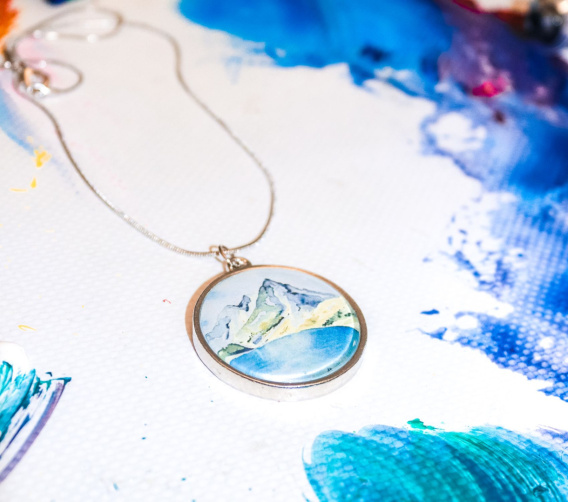 Pejzaż "Kocham góry" to naszyjnik nie tylko dla osób kochających góry, ale także dla amatorów pięknych widoków czy po prostu błękitnych, delikatnych barw. Całość zamknięta jest w delikatnej srebrnej zawieszce zawieszonej na cienkim, krótkim łańcuszku.