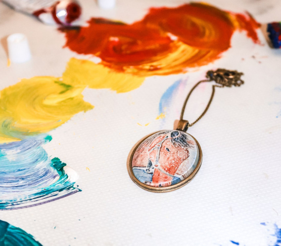 Obraz "Koń" to naszyjnik dla miłośników tego pięknego zwierzęcia. Rysunek jest w ciepłych barwach co sprawia, że idealnie komponuje się z delikatną, złotą zawieszką. Całość jest na krótkim łańcuszku.