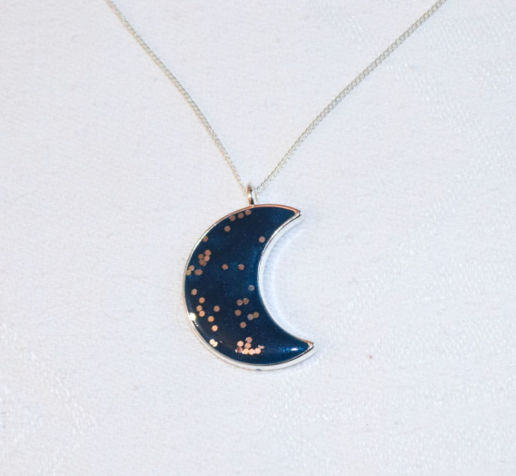 Naszyjnik "Księżycowa noc" to niezwykle uroczy i elegancki dodatek, który doda blasku każdej stylizacji. Zawieszka w kształcie księżyca nawiązuje do magicznej atmosfery nocnego nieba. Granatowe tło z drobinkami brokatu nadaje naszyjnikowi wyjątkowego charakteru i sprawia, że błyszczy delikatnym światłem. Ten subtelny naszyjnik doskonale komponuje się zarówno z casualowymi outfitami na co dzień, jak i z eleganckimi kreacjami na wieczorne wyjścia. Jest idealnym dodatkiem dla kobiet ceniących sobie oryginalność oraz chcących podkreślić swoją indywidualność poprzez modę. Zamów już dziś naszyjnik "Księżycowa noc" i poczuj magię wieczornego nieba na własnej skórze!