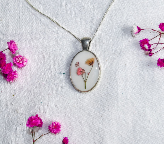 Naszyjnik "Laurka" to delikatny i uroczy dodatek, który doda subtelności każdej stylizacji. Jego dziewczęcy charakter sprawia, że idealnie nadaje się jako prezent dla bliskiej osoby lub jako wyraz miłości i troski o siebie. Owalna zawieszka tego naszyjnika jest niezwykle subtelna i elegancka. Białe tło podkreśla delikatność całego designu, tworząc harmonijną całość. Różowe kwiaty gipsówki zatopione w żywicy dodają mu unikalnego uroku oraz lekkości. Naszyjnik "Laurka" doskonale komponuje się zarówno z codziennymi stylizacjami jak i wieczorowymi kreacjami. Doskonale sprawdzi się jako element garderoby na wiele sezonów, zachowując swoje piękno i świeży wygląd. Zamów już dziś naszyjnik "Laurka" i ciesz się jego wyjątkowym wdziękiem oraz możliwościami stylizacyjnymi, jakie oferuje!