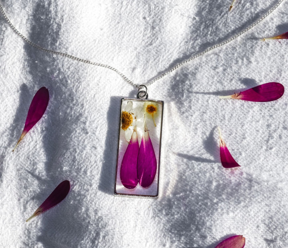 Naszyjnik "Letni impresjonizm" to jak muśnięcie pędzla na płótnie - ten naszyjnik to żywa impresja lata, zamknięta w prostokątnej formie i zatopiona w krystalicznej żywicy. Płatki fioletowej gerbery, kwiaty rumianku i żółta mimoza tworzą wyrazistą, a jednocześnie subtelną kompozycję, która przyciąga wzrok jak zachód słońca w pełni lipca. To biżuteria, która niesie radość, lekkość i odrobinę sztuki na co dzień. Symbolika kwiatów w naszyjniku: Gerbera - symbol radości, optymizmu i kobiecej energii; rumianek - znak spokoju, prostoty i naturalnego ukojenia; mimoza - kwiat delikatności, czułości i odwagi w wyrażaniu emocji. Podaruj go komuś bliskiemu albo sobie samej - jako przypomnienie, że każdy dzień może być odrobinę piękniejszy, jeśli tylko dostrzeżemy jego kolory.