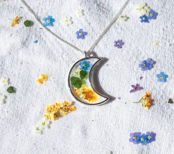"Niezapomniana noc" to naszyjnik, który zachwyci każdą kobietę swoim niezwykłym urokiem i delikatnością. Zawieszka w kształcie księżyca sprawia, że biżuteria ta emanuje tajemniczością i magią nocy. Zanurzone w przeźroczystej żywicy kwiaty niezapominajki, smagliczki oraz liście koniczyny dodają jej subtelności i naturalnego piękna. Ten wyjątkowy naszyjnik doskonale komponuje się zarówno z eleganckimi wieczorowymi stylizacjami, jak i codziennymi outfitami. Jest idealnym dodatkiem do romantycznych sukienek czy casualowych bluzek i jeansów. Wykonany z największą starannością i precyzją naszyjnik "Niezapomniana noc" jest nie tylko modnym dodatkiem, ale także wyrazem indywidualności jego właścicielki. Kwiatowe motywy symbolizują delikatność, kobiecość oraz piękno natury - wartości cenione przez współczesne kobiety. Jeśli chcesz dodać odrobinę magii do swojej garderoby oraz podkreślić swój unikalny styl, ten naszyjnik jest właśnie dla Ciebie!