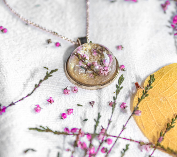 Naszyjnik "Słoneczny wrzos" to niezwykłe połączenie natury i sztuki, które zachwyci każdą miłośniczkę oryginalnych dodatków. Prawdziwy żółty liść oraz delikatne kwiaty wrzosu zanurzone w przeźroczystej żywicy tworzą unikalną kompozycję, która przyciąga spojrzenia i budzi zachwyt. Ten wyjątkowy naszyjnik jest nie tylko pięknym dodatkiem do codziennych stylizacji, ale także doskonałym sposobem na podkreślenie swojej indywidualności i bliskości z naturą. Kwiaty wrzosu symbolizują siłę, wytrwałość oraz tajemniczość, natomiast żółty liść dodaje całości energii i radości. Pozwól sobie na chwilę luksusu i magii natury dzięki naszemu niepowtarzalnemu naszyjnikowi "Słoneczny wrzos".