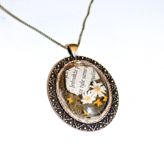 W ręcznie robionym naszyjniku "Wspomnienie dawnych lat" w żywicy epoksydowej zatopiony jest kawałek postarzanego papieru, prawdziwe suszone kwiaty oraz miniaturki brokatowych motyli.