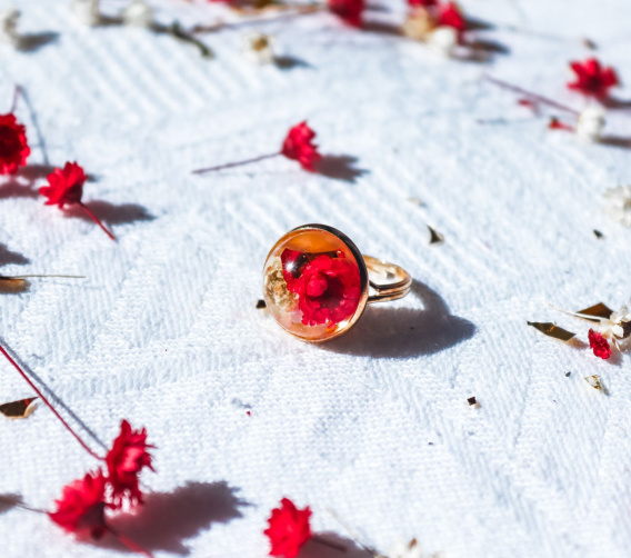 Pierścionek "Polskie lato", wersja złota to wyjątkowy dodatek do Twojej kolekcji biżuterii. Został stworzony z myślą o miłośniczkach natury i piękna. Prawdziwe czerwone i białe kwiaty gliksja zostały zanurzone w krystalicznie przezroczystej żywicy, tworząc niepowtarzalny efekt. To pierścionek, który przyciąga spojrzenia i zachwyca swoim delikatnym wzornictwem. Kwiaty gliksja symbolizują radość, urodę oraz subtelność - idealne wartości do wyrażenia poprzez biżuterię. Dzięki połączeniu naturalnych elementów z nowoczesnym designem, pierścionek ten doskonale sprawdzi się zarówno na co dzień, jak i na specjalne okazje. Wykonany z dbałością o najmniejsze detale, pierścionek "Polskie lato" jest pięknym dodatkiem do stroju. Każdy egzemplarz jest unikatowy dzięki różnorodności kształtów i rozmiarów kwiatów gliksja. Daj sobie możliwość noszenia ze sobą kawałka natury i poczuj bliskość ziemi nawet w miejskiej dżungli. Pierścionek "Polskie lato" to więcej niż biżuteria - to manifestacja miłości do otaczającego nas świata.
