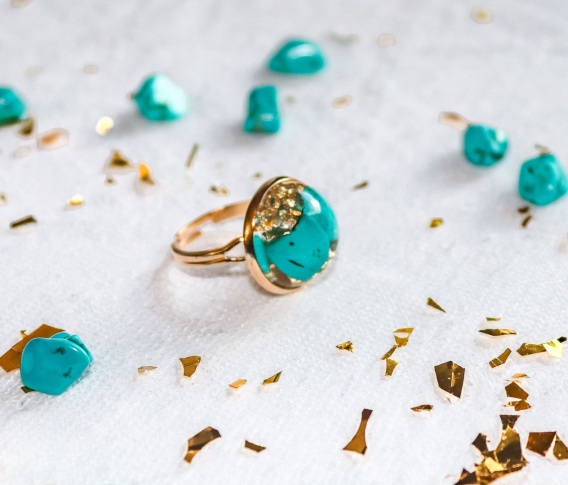 Pierścionek "Złoty turkus" to nietypowa propozycja w świecie biżuterii. Wyjątkowy design tego pierścionka sprawia, że jest on niezwykle elegancki i stylowy. Kamienie turkusu zatopione w klarownej żywicy tworzą niepowtarzalny efekt, który przyciąga spojrzenia i dodaje blasku każdej stylizacji. Piękny odcień niebieskiego turkusu doskonale komponuje się z błyszczącą złotą folią, która subtelnie odbija światło, nadając pierścionkowi jeszcze większej wyrazistości. Połączenie kolorów turkusowego kamienia i złotej folii tworzy harmonijną całość, która zachwyca swoim urokiem i finezją. Ten pierścionek doskonale sprawdzi się jako dodatek do wieczorowej kreacji czy eleganckiego stroju na specjalne okazje. Jego designerski charakter podkreśli Twój indywidualny styl oraz doda szyku każdej stylizacji. Dzięki niemu poczujesz się wyjątkowo i olśnisz wszystkich swoim gustem oraz stylem. Jeśli poszukujesz czegoś nietuzinkowego, co podkreśli Twoją osobowość oraz doda blasku Twojej garderobie - pierścionek "Złoty turkus" spełni Twoje oczekiwania!
