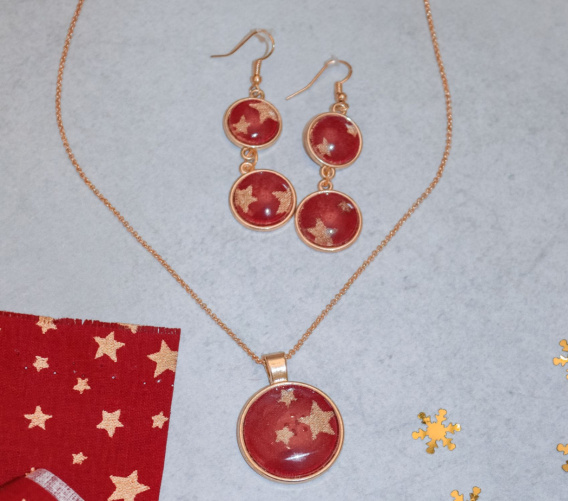 Świąteczny zestaw jest idealnym dodatkiem do Twojej świątecznej stylizacji. Ten piękny zestaw to szklane kaboszony naklejone na świąteczny czerwony materiał ozdobiony złotymi gwiazdkami, które nadają mu wyjątkowego uroku i blasku (miejsce cięcia materiału może się różnić a co za tym idzie rozmieszczenie czy ilość gwiazdek może być inna niż prezentowana na zdjęciach). Złota oprawa doskonale komponuje się z całością, podkreślając elegancję i szyk. Ten zestaw to nie tylko modny dodatek, ale również symbol magicznego czasu świąt Bożego Narodzenia. Jego klasyczne kolory oraz delikatne wzornictwo sprawią, że będziesz czuć się wyjątkowo na każdej uroczystości czy spotkaniu rodzinno-przyjacielskim.