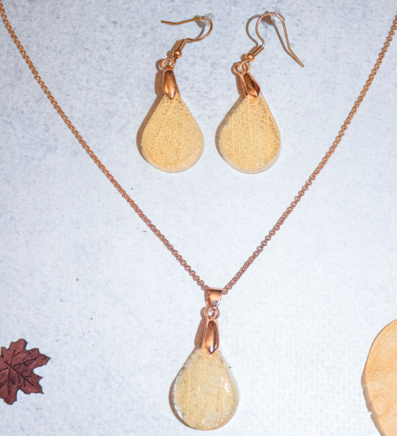 Zestaw "Krople jesieni" to wyjątkowy i elegancki dodatek inspirowany naturą. Jego delikatne kolory i subtelne detale sprawiają, że doskonale pasuje do każdego stroju. Bez względu na okazję - czy to formalne spotkanie biznesowe, romantyczna kolacja czy wieczór ze znajomymi - ten zestaw doskonale dopełni Twój look. W naszyjniku i kolczykach z żywicy zatopione są prawdziwe suszone liście co nadaje im niepowtarzalny charakter a każdy egzemplarz jest wyjątkowy.
