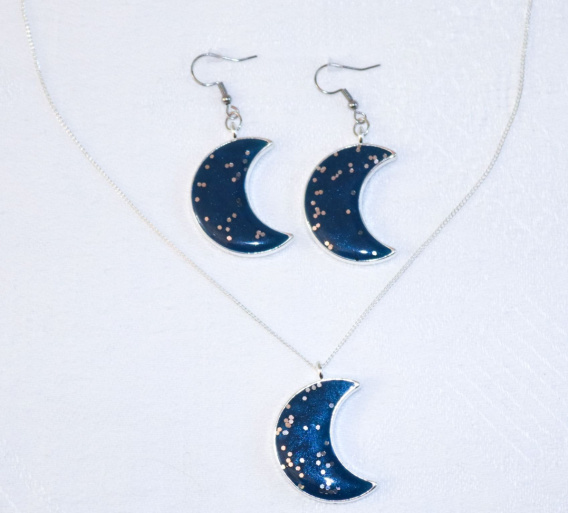 Zestaw "Księżycowa noc" to niezwykle uroczy i elegancki dodatek, który doda blasku każdej stylizacji. Zawieszka w kształcie księżyca nawiązuje do magicznej atmosfery nocnego nieba. Granatowe tło z drobinkami brokatu nadaje zestawowi wyjątkowego charakteru i sprawia, że błyszczy delikatnym światłem. Ten subtelny zestaw doskonale komponuje się zarówno z casualowymi outfitami na co dzień, jak i z eleganckimi kreacjami na wieczorne wyjścia. Jest idealnym dodatkiem dla kobiet ceniących sobie oryginalność oraz chcących podkreślić swoją indywidualność poprzez modę. Zamów już dziś zestaw "Księżycowa noc" i poczuj magię wieczornego nieba na własnej skórze!