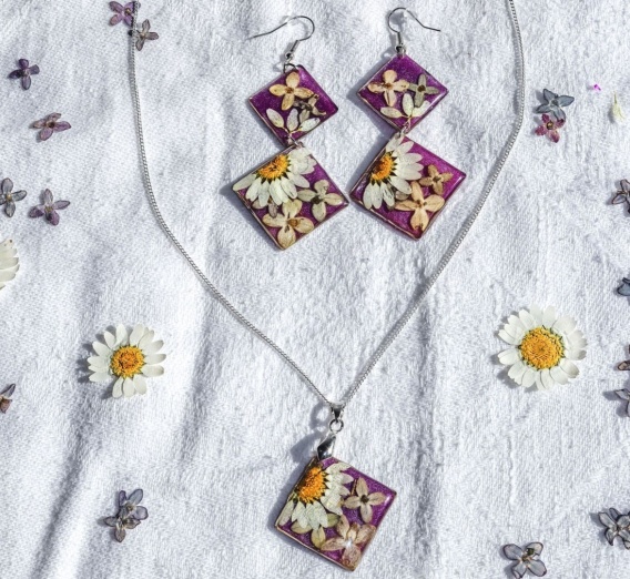 Zestaw „Lilak” to połączenie delikatnego fioletu żywicy z zatopionymi w niej prawdziwymi kwiatami – połówką rumianku i kwiatami lilaka (bzu). To subtelna kompozycja zamknięta w delikatnej zawieszce. Całość tworzyelegancki, romantyczny i niepowtarzalny obraz, który zachwyca swoją naturalnością i lekkością. Rumianek – symbol ukojenia, spokoju i troski; lilak (bez) – symbol wiosny, miłości i nowych początków. „Lilak” to biżuteria, która będzie pięknym prezentem dla osoby ceniącej bliskość natury, wyjątkowe detale i spokojną energię. A może podarujesz ją samej sobie, jako talizman codziennej uważności?