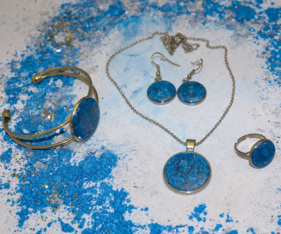 Kolekcja czterech żywiołów - woda, ogień, niebo i ziemia - reprezentuje unikalne cechy natury i symbolizuje różne aspekty życia. Biżuteria przedstawiająca wodę to malowane żywicą fale morskie i zatopiony w żywicy prawdziwy piasek; biżuteria odzwierciedlająca siłę ognia to malowane żywicą płomienie a całość zamknięta jest w złotej oprawie; ziemia przedstawiona jest poprzez zatopione w żywicy prawdziwe suszone rośliny a rzemyk dodaje naszyjnikowi naturalnego wyglądu; zaś niebo pokazane pod osłoną nocy.