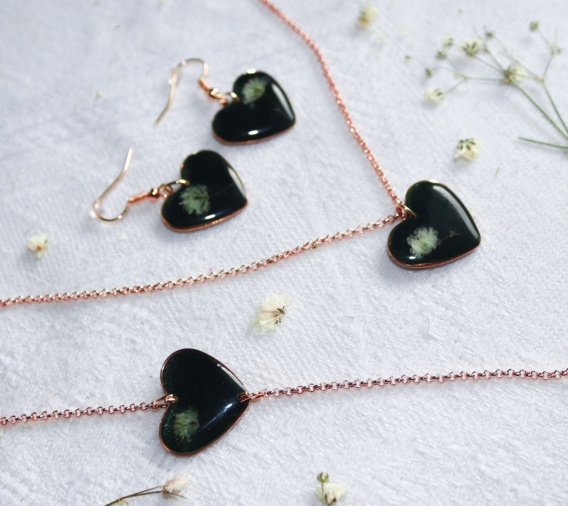 Zestaw "Zielone serce" to wyjątkowy dodatek do Twojej kolekcji biżuterii. Delikatna złota zawieszka w kształcie serca jest elegancka i subtelna, idealna na co dzień oraz na specjalne okazje. Tło w pięknym kolorze butelkowej zieleni nadaje zestawowi unikalny charakter, który przyciąga spojrzenia. To, co sprawia, że ten zestaw jest tak wyjątkowy, to delikatny prawdziwy kwiat gipsówki zatopiony w żywicy. Kwiat zachwyca swoim naturalnym pięknem i dodaje zestawowi uroku oraz lekkości. Dzięki temu każdy egzemplarz jest niepowtarzalny i ma swój własny indywidualny charakter. Zestaw może być doskonałym prezentem dla bliskiej osoby lub samego siebie - jako wyraz miłości czy wdzięczności. Dodaj odrobinę natury do swojej garderoby dzięki temu urokliwemu zestawowi "Zielone serce".