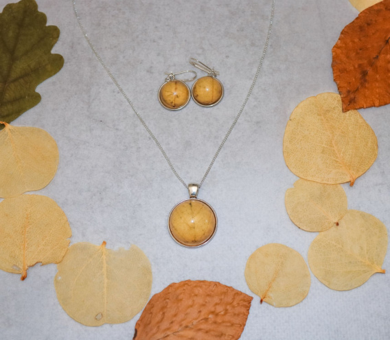 Zestaw "Złota jesień" doda elegancji i wyjątkowego uroku Twoim codziennym stylizacjom. Jego największym atutem jest zatopiony w żywicy prawdziwy żółty liść, który nadaje mu naturalnego charakteru i sprawia, że każdy egzemplarz jest unikalny.
