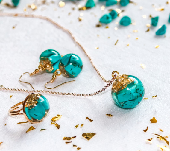 Zestaw "Złoty turkus" to nietypowa propozycja w świecie biżuterii. Wyjątkowy design tego zestawu sprawia, że jest on niezwykle elegancki i stylowy. Kamienie turkusu zatopione w klarownej żywicy tworzą niepowtarzalny efekt, który przyciąga spojrzenia i dodaje blasku każdej stylizacji. Piękny odcień niebieskiego turkusu doskonale komponuje się z błyszczącą złotą folią, która subtelnie odbija światło, nadając zestawowi jeszcze większej wyrazistości. Połączenie kolorów turkusowego kamienia i złotej folii tworzy harmonijną całość, która zachwyca swoim urokiem i finezją. Ten zestaw doskonale sprawdzi się jako dodatek do wieczorowej kreacji czy eleganckiego stroju na specjalne okazje. Jego designerski charakter podkreśli Twój indywidualny styl oraz doda szyku każdej stylizacji. Dzięki niemu poczujesz się wyjątkowo i olśnisz wszystkich swoim gustem oraz stylem. Jeśli poszukujesz czegoś nietuzinkowego, co podkreśli Twoją osobowość oraz doda blasku Twojej garderobie - zestaw "Złoty turkus" spełni Twoje oczekiwania!