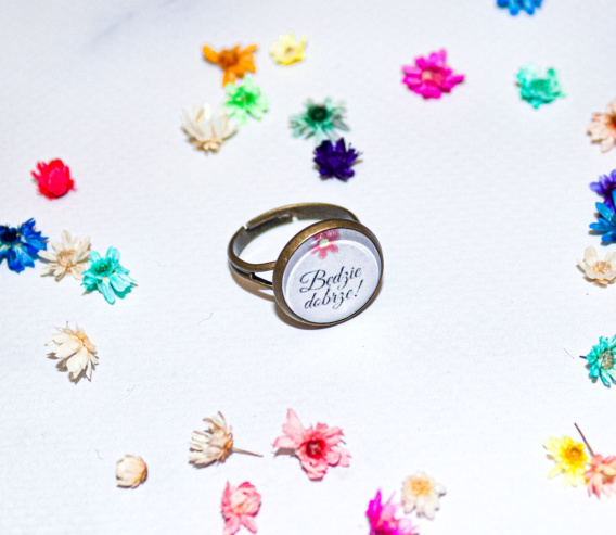 • Złoty pierścionek "Będzie dobrze!" z kwiatkiem